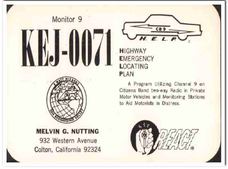 Original QSL postcard from the mid to late 1960s.This unused card was sent from CB radio station: KEJ-0071. Was issued to Melvin G. Nutting, at 932 Western Avenue, Colton, California. Was a member of REACT. This card was made with rounded corners. During the 1920s and 1930s, amateur ham radio operators adopted the practice of two-way exchanging of QSL postcards, to confirm their radio contact, with a report of reception. QSL cards got to be known as wallpaper, commonly used to decorate the walls of their radio equipment room. During the 1960s, CB citizen band radio became popular, and the practice of exchanging QSL cards to confirm radio contacts was enjoyed by many with this new hobby. Today, these cards are very collectible and look great matted and framed.