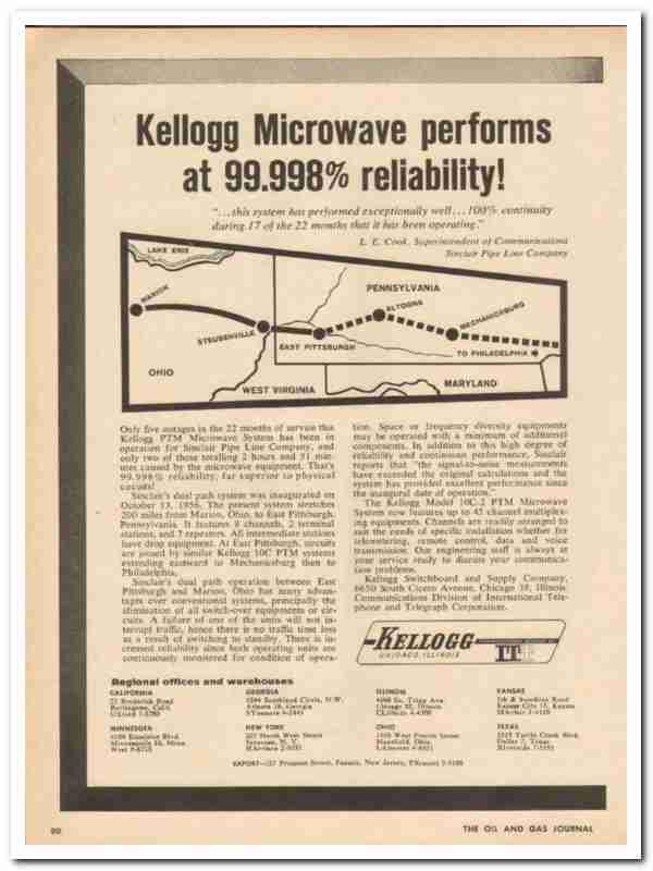 Original vintage magazine ad for KELLOGG SWITCHBOARD AND SUPPLY COMPANY. Microwave performs at 99.99 percent reliability. Preformed exceptionally well says L.E. Cook, Superintendent of Communications, Sinclair Pipe Line Company.