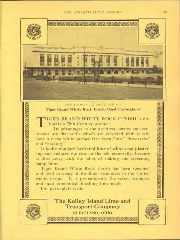 Original vintage architectural trade magazine ad for THE KELLY ISLAND LIME AND TRANSPORT COMPANY of Cleveland, OH. Tiger Brand White Rock Finish Used Throughout at the New Terminal at Baltimore, MD. Old 1912 construction industry advertisement,
