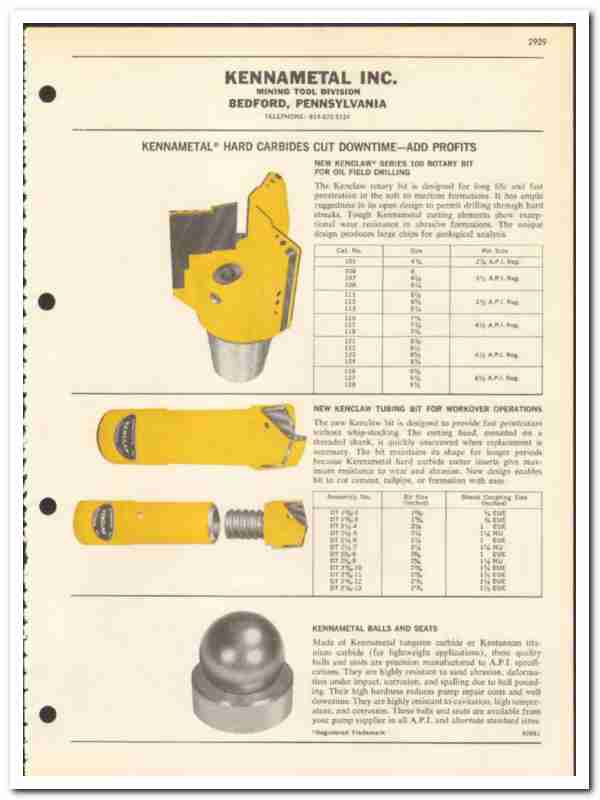 Products include Kenclaw Series 100 Rotary Bits, Kenclaw Tubing Bit for Workover Operations, Kennametal Balls and Seats, all are fully featured.