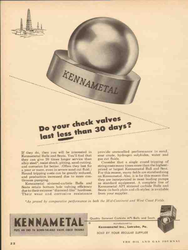 Original vintage oil and gas trade magazine ad for KENNAMETAL, INC. of Latrobe, PA. Do Your Check Valves Last Less Than 30 Days? If they do, then you will be interested in Kennametal Balls and Seats. Old 1953 petroleum industry advertisement.