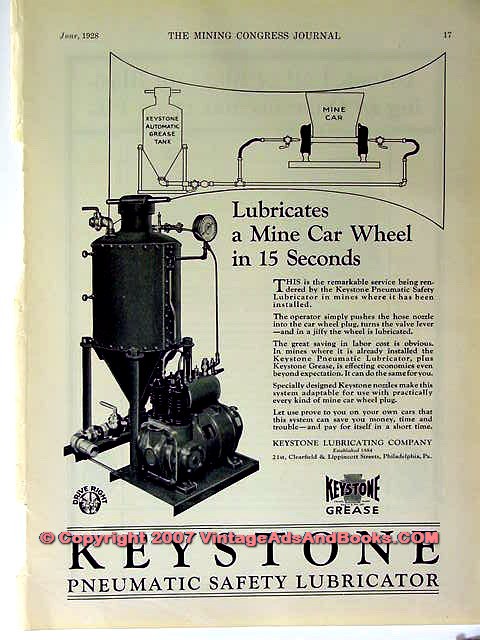 Original vintage magazine ad, KEYSTONE LUBRICATING COMPANY, of 21st Clearfield & Lippincott Streets, Philadelphia, PA. KEYSTONE PNEUMATIC SAFETY LUBRICATOR. "Lubricates a Mine Car Wheel in 15 Seconds". Old 1928 mining lubricating equipment advertisement. Would display nicely matted and framed!