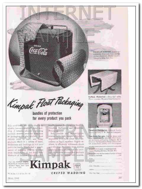 Original vintage industrial magazine ad, for KIMBERLY-CLARK CORPORATION of Neenah, WI. Kimpak Float Packaging Bundles of Protection for Every Product You Pack. Pictured is a Coca Cola Drink Box. Cloud-soft Kempak shields the unwieldy dispenser from damage during shipment. Photo courtesy of Temprite Manufacturing Company, Inc. Old 1948 industry advertisement. (The scan shows a slight pink tint that is not on the actual ad.)