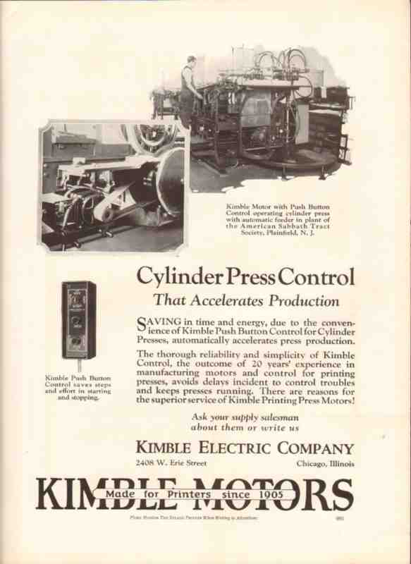 Original old printer magazine vintage ad for KIMBLE ELECTRIC COMPANY in Chicago, IL. Cylinder Press Control that accelerates production. Shown in plant of the American Sabbath Tract Society in Plainfield, NJ. Saving time and energy, avoids delays and keeps presses running. Was located at 2408 W. Erie Street. This 1926 unique one page printing industry trade advertisement would display beautifully matted and framed.