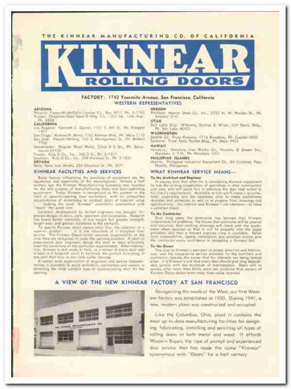 Original 1948 door trade vintage catalog for the KINNEAR MANUFACTURING COMPANY OF CALIFORNIA. Main office and plant was located at 1742 Yosemite Avenue, San Francisco, CA. (Established 1930).