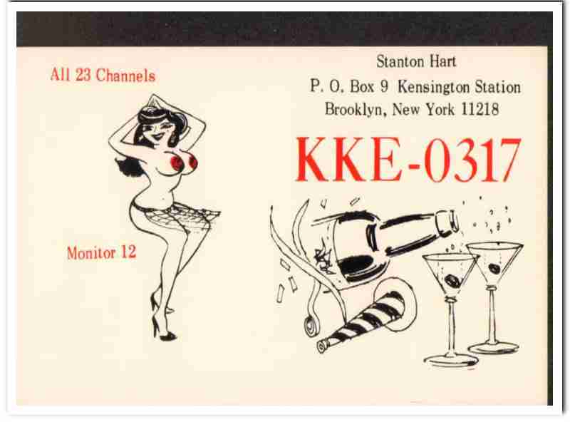 Original QSL postcard from the mid to late 1960s.This card was sent from CB radio station: KKE-0317. Was issued to Stanton Hart, of Brooklyn, New York. Champagne, noise maker, nude dancer. During the 1920s and 1930s, amateur ham radio operators adopted the practice of two-way exchanging of QSL postcards, to confirm their radio contact, with a report of reception. QSL cards got to be known as wallpaper, commonly used to decorate the walls of their radio equipment room. During the 1960s, CB citizen band radio became popular, and the practice of exchanging QSL cards to confirm radio contacts was enjoyed by many with this new hobby. Today, these cards are very collectible and look great matted and framed.