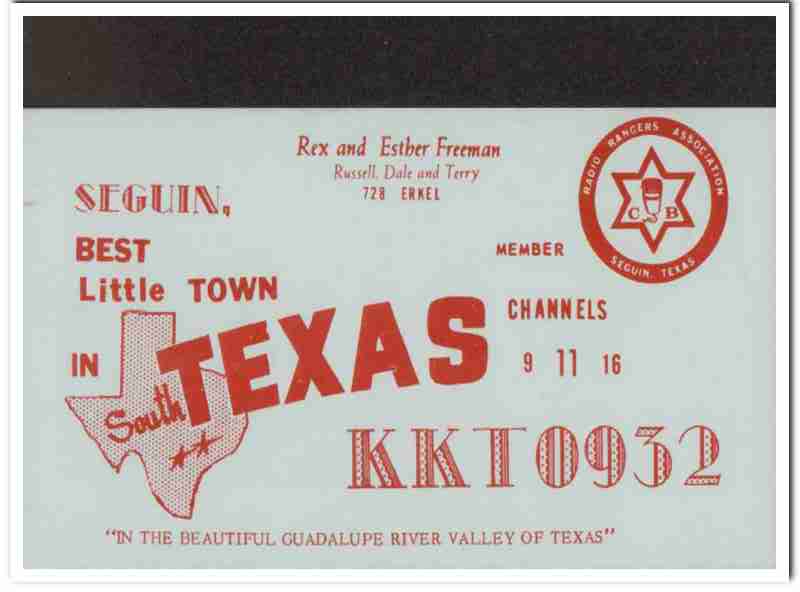 Original QSL postcard from the mid to late 1960s.This card was sent from CB radio station: KKT-0932. Was issued to Esther and Rex Freeman, at 728 Erkel Avenue, Seguin, Texas. Childrens names are Russell, Dale and Terry. Seguin, Best Little Town in South Texas. In the beautiful Guadalupe River Valley of Texas. During the 1920s and 1930s, amateur ham radio operators adopted the practice of two-way exchanging of QSL postcards, to confirm their radio contact, with a report of reception. QSL cards got to be known as wallpaper, commonly used to decorate the walls of their radio equipment room. During the 1960s, CB citizen band radio became popular, and the practice of exchanging QSL cards to confirm radio contacts was enjoyed by many with this new hobby. Today, these cards are very collectible and look great matted and framed.
