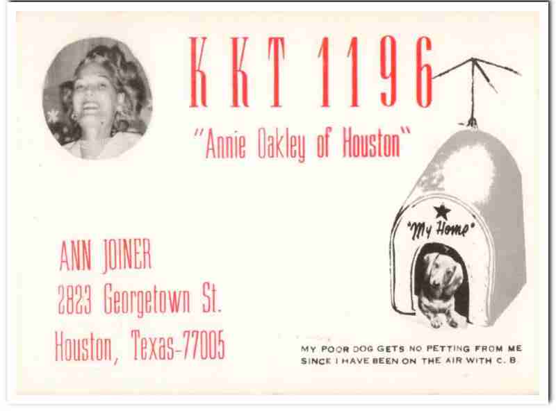 Original QSL postcard from the mid to late 1960s.This card was sent from CB radio station: KKT-1196. Was issued to Ann Joiner, at 2833 Georgetown Street, Houston, Texas. Her CB handle was Annie Oakley of Houston. My poor dog gets no petting from me since I have been on the air with C.B. During the 1920s and 1930s, amateur ham radio operators adopted the practice of two-way exchanging of QSL postcards, to confirm their radio contact, with a report of reception. QSL cards got to be known as wallpaper, commonly used to decorate the walls of their radio equipment room. During the 1960s, CB citizen band radio became popular, and the practice of exchanging QSL cards to confirm radio contacts was enjoyed by many with this new hobby. Today, these cards are very collectible and look great matted and framed.