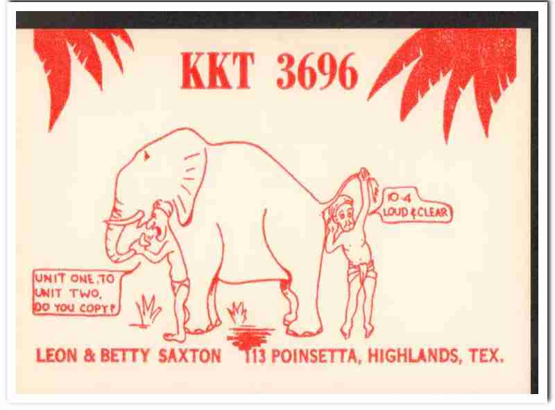 Original QSL postcard from the mid to late 1960s.This card was sent from CB radio station: KKT-3693. Was issued to Betty and Leon Saxton, at 113 Poinsetta Lane, Highlands, Texas. Elephant. During the 1920s and 1930s, amateur ham radio operators adopted the practice of two-way exchanging of QSL postcards, to confirm their radio contact, with a report of reception. QSL cards got to be known as wallpaper, commonly used to decorate the walls of their radio equipment room. During the 1960s, CB citizen band radio became popular, and the practice of exchanging QSL cards to confirm radio contacts was enjoyed by many with this new hobby. Today, these cards are very collectible and look great matted and framed.