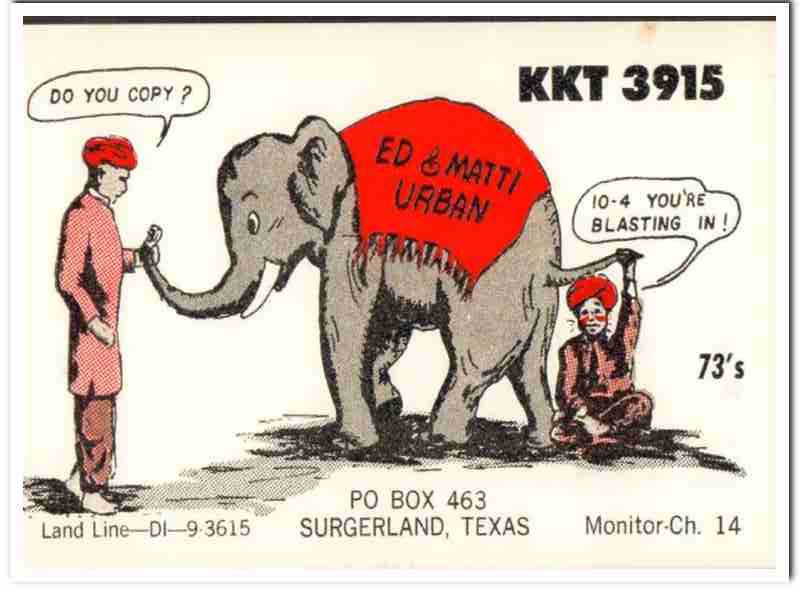 Original QSL postcard from the mid to late 1960s.This card was sent from CB radio station: KKT-3915. Was issued to Matti and Ed Urban, at 610 Kyle Street, Sugarland, Texas. Elephant. During the 1920s and 1930s, amateur ham radio operators adopted the practice of two-way exchanging of QSL postcards, to confirm their radio contact, with a report of reception. QSL cards got to be known as wallpaper, commonly used to decorate the walls of their radio equipment room. During the 1960s, CB citizen band radio became popular, and the practice of exchanging QSL cards to confirm radio contacts was enjoyed by many with this new hobby. Today, these cards are very collectible and look great matted and framed.