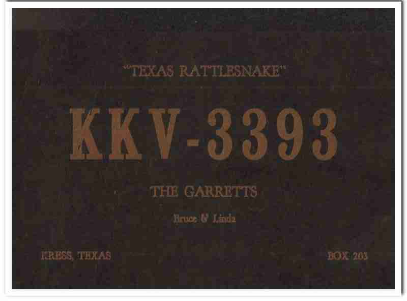 Original QSL postcard from the mid to late 1960s.This card was sent from CB radio station: KKV-3393. Was issued to Linda and Bruce Garrett, of Kress, Texas. His CB handle was The Texas Rattlesnake. During the 1920s and 1930s, amateur ham radio operators adopted the practice of two-way exchanging of QSL postcards, to confirm their radio contact, with a report of reception. QSL cards got to be known as wallpaper, commonly used to decorate the walls of their radio equipment room. During the 1960s, CB citizen band radio became popular, and the practice of exchanging QSL cards to confirm radio contacts was enjoyed by many with this new hobby. Today, these cards are very collectible and look great matted and framed.