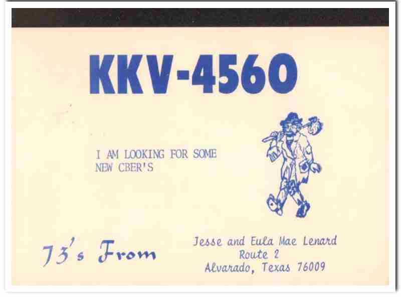 Original QSL postcard from the mid to late 1960s.This card was sent from CB radio station: KKV-4560. Was issued to Eula Mae and Jesse Lenard ,at Route 2, Alvarado, Texas. I aam looking for some new CBers. Hobo. During the 1920s and 1930s, amateur ham radio operators adopted the practice of two-way exchanging of QSL postcards, to confirm their radio contact, with a report of reception. QSL cards got to be known as wallpaper, commonly used to decorate the walls of their radio equipment room. During the 1960s, CB citizen band radio became popular, and the practice of exchanging QSL cards to confirm radio contacts was enjoyed by many with this new hobby. Today, these cards are very collectible and look great matted and framed.