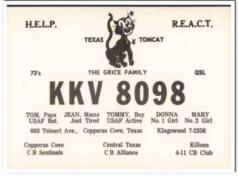 Original QSL postcard from the mid to late 1960s.This card was sent from CB radio station: KKV-8098. Was issued to Jean and Tom Grice, at 603 Teinert Avenue, Copperas Cove, Texas. His CB handle was Texas Tomcat. Children names listed are Tommy, Donna and Mary During the 1920s and 1930s, amateur ham radio operators adopted the practice of two-way exchanging of QSL postcards, to confirm their radio contact, with a report of reception. QSL cards got to be known as wallpaper, commonly used to decorate the walls of their radio equipment room. During the 1960s, CB citizen band radio became popular, and the practice of exchanging QSL cards to confirm radio contacts was enjoyed by many with this new hobby. Today, these cards are very collectible and look great matted and framed.