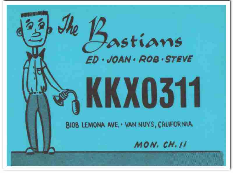 Original QSL postcard from the mid to late 1960s.This unused card was sent from CB radio station: KKX-0311. Was issued to Joan and Ed Bastian, at 8108 Lemona Avenue, Van Nuys, California. The Bastians. Children names are Rob and Steve Bastian. Card is blue with black text. During the 1920s and 1930s, amateur ham radio operators adopted the practice of two-way exchanging of QSL postcards, to confirm their radio contact, with a report of reception. QSL cards got to be known as wallpaper, commonly used to decorate the walls of their radio equipment room. During the 1960s, CB citizen band radio became popular, and the practice of exchanging QSL cards to confirm radio contacts was enjoyed by many with this new hobby. Today, these cards are very collectible and look great matted and framed.