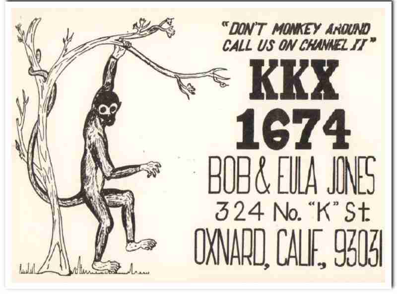Original QSL postcard from the mid to late 1960s.This unused card was sent from CB radio station: KKX-1674. Was issued to Eula and Bob Jones, at 324 North K Street, Oxnard, California. Card has an image of a monkey in a tree. Dont Monkey Around. During the 1920s and 1930s, amateur ham radio operators adopted the practice of two-way exchanging of QSL postcards, to confirm their radio contact, with a report of reception. QSL cards got to be known as wallpaper, commonly used to decorate the walls of their radio equipment room. During the 1960s, CB citizen band radio became popular, and the practice of exchanging QSL cards to confirm radio contacts was enjoyed by many with this new hobby. Today, these cards are very collectible and look great matted and framed.