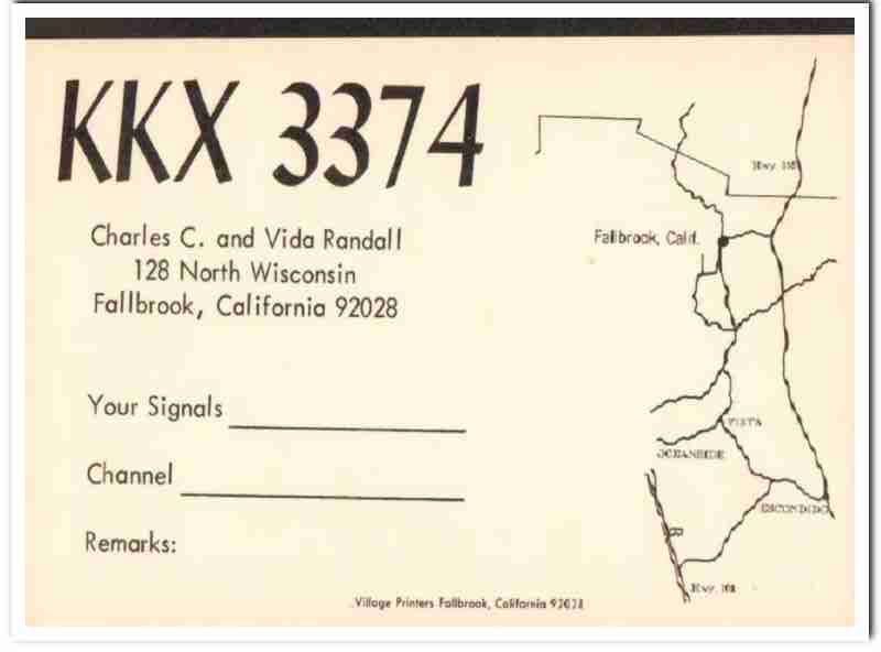 KKX-3374 Charles Randall Fallbrook CA 1960s Vintage Postcard CB QSL