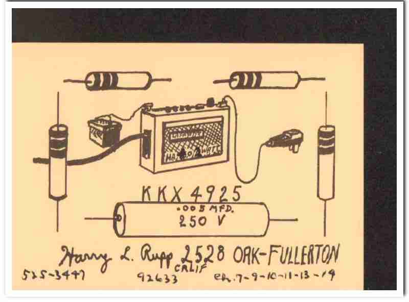 Original QSL postcard from the mid to late 1960s.This unused card was sent from CB radio station: KKX-4925. Was issued to Harry L. Rupp, at 2528 West Oak Avenue, Fullerton, California. Card has images of resisitors and capacitors. During the 1920s and 1930s, amateur ham radio operators adopted the practice of two-way exchanging of QSL postcards, to confirm their radio contact, with a report of reception. QSL cards got to be known as wallpaper, commonly used to decorate the walls of their radio equipment room. During the 1960s, CB citizen band radio became popular, and the practice of exchanging QSL cards to confirm radio contacts was enjoyed by many with this new hobby. Today, these cards are very collectible and look great matted and framed.