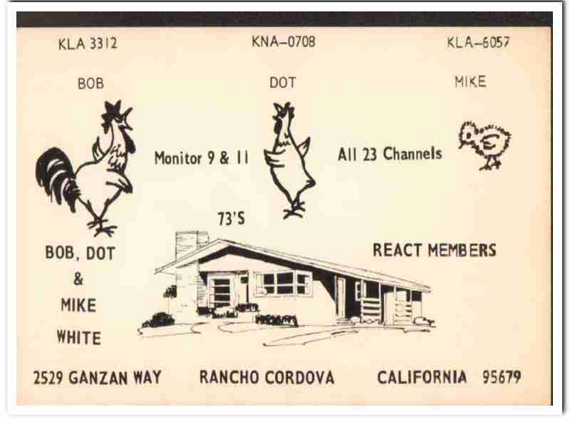 Original QSL postcard from the mid to late 1960s.This unused card was sent from CB radio station: KLA-3312. Was issued to Bob White, KNA-0708 was issued to Dot White, and KLA-6057, was issed to Mike White, at 2529 Ganzan Way, Rancho Cordova, California. Members of React. During the 1920s and 1930s, amateur ham radio operators adopted the practice of two-way exchanging of QSL postcards, to confirm their radio contact, with a report of reception. QSL cards got to be known as wallpaper, commonly used to decorate the walls of their radio equipment room. During the 1960s, CB citizen band radio became popular, and the practice of exchanging QSL cards to confirm radio contacts was enjoyed by many with this new hobby. Today, these cards are very collectible and look great matted and framed.