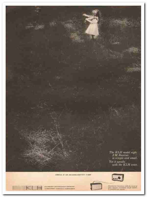 Original vintage ad for KLH RESEARCH DEVELOPMENT CORPORATION. Model Eight FM Receiver is simple and small. Yet it speaks with the KLH voice. Artwork shows small girl playing a violin.