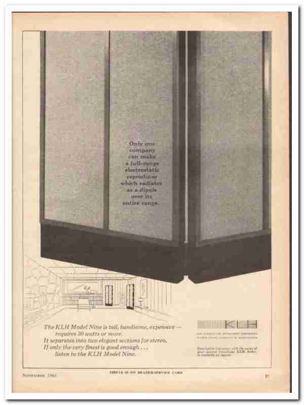 Original vintage ad for KLH RESEARCH DEVELOPMENT CORPORATION. Model Nine speaker is tall, handsome, expensive, requires 30 watts or more. It separates into two elegant sections for stereo. Only one company can make a full-range electrostatic reproducer which radiates as a dipole over its entire range.