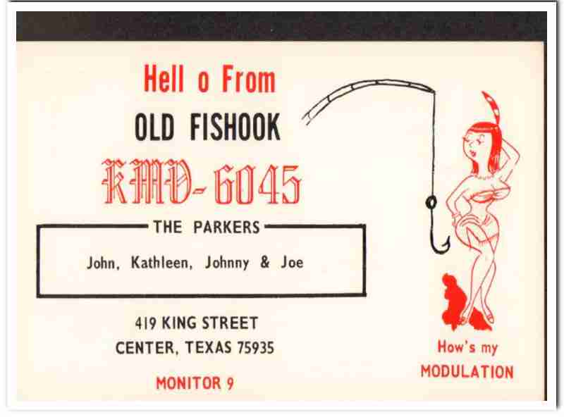 Original QSL postcard from the mid to late 1960s.This card was sent from CB radio station: KMD-6045. Was issued to Kathleen and John Parker, at 419 King Street, Center, Texas. His CB handle was Old Fishook. Childrens names are Johnny and Joe. Hell o From Old Fishook. During the 1920s and 1930s, amateur ham radio operators adopted the practice of two-way exchanging of QSL postcards, to confirm their radio contact, with a report of reception. QSL cards got to be known as wallpaper, commonly used to decorate the walls of their radio equipment room. During the 1960s, CB citizen band radio became popular, and the practice of exchanging QSL cards to confirm radio contacts was enjoyed by many with this new hobby. Today, these cards are very collectible and look great matted and framed.