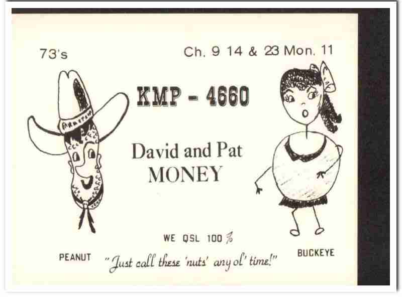 Original QSL postcard from the mid to late 1960s.This card was sent from CB radio station: KMP-4660. Was issued to Pat and David Money, at 2171 Avenue J, Wichita Falls, Texas. His CB handle was Peanut, and her CB handle was Buckeye.  Just Call These Nuts Any Ol Time!  During the 1920s and 1930s, amateur ham radio operators adopted the practice of two-way exchanging of QSL postcards, to confirm their radio contact, with a report of reception. QSL cards got to be known as wallpaper, commonly used to decorate the walls of their radio equipment room. During the 1960s, CB citizen band radio became popular, and the practice of exchanging QSL cards to confirm radio contacts was enjoyed by many with this new hobby. Today, these cards are very collectible and look great matted and framed.