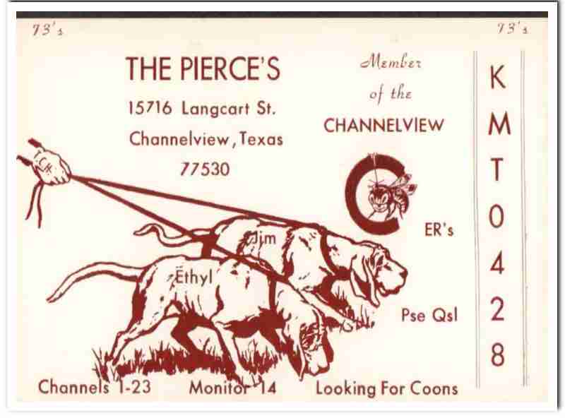 Original QSL postcard from the mid to late 1960s.This unused card was sent from CB radio station: KMT-0428. Was issued to Ethyl and Jim Pierce, at 15716 Langcart Street, Chanelview, Texas. Looking For Coons. During the 1920s and 1930s, amateur ham radio operators adopted the practice of two-way exchanging of QSL postcards, to confirm their radio contact, with a report of reception. QSL cards got to be known as wallpaper, commonly used to decorate the walls of their radio equipment room. During the 1960s, CB citizen band radio became popular, and the practice of exchanging QSL cards to confirm radio contacts was enjoyed by many with this new hobby. Today, these cards are very collectible and look great matted and framed.