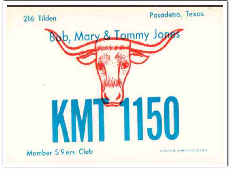 Original QSL postcard from the mid to late 1960s.This card was sent from CB radio station: KMT-1150. Was issued to Mary and Bob Jones, of 216 Tilden Drive, Pasadena, Texas. Childs name is Tommy Jones. Texas long horn steer. During the 1920s and 1930s, amateur ham radio operators adopted the practice of two-way exchanging of QSL postcards, to confirm their radio contact, with a report of reception. QSL cards got to be known as wallpaper, commonly used to decorate the walls of their radio equipment room. During the 1960s, CB citizen band radio became popular, and the practice of exchanging QSL cards to confirm radio contacts was enjoyed by many with this new hobby. Today, these cards are very collectible and look great matted and framed.