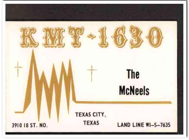 Original QSL postcard from the mid to late 1960s.This unused card was sent from CB radio station: KMT-1630. Was issued to The McNeel Family, at 3910 18th Street North, Texas City, Texas. During the 1920s and 1930s, amateur ham radio operators adopted the practice of two-way exchanging of QSL postcards, to confirm their radio contact, with a report of reception. QSL cards got to be known as wallpaper, commonly used to decorate the walls of their radio equipment room. During the 1960s, CB citizen band radio became popular, and the practice of exchanging QSL cards to confirm radio contacts was enjoyed by many with this new hobby. Today, these cards are very collectible and look great matted and framed.