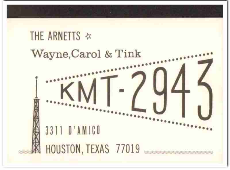 Original QSL postcard from the mid to late 1960s.This card was sent from CB radio station: KMT-2943. Was issued to Carol and Wayne Arnett, at 3311 D Amico Street, Houston, Texas. Child name is Tink. Black text. During the 1920s and 1930s, amateur ham radio operators adopted the practice of two-way exchanging of QSL postcards, to confirm their radio contact, with a report of reception. QSL cards got to be known as wallpaper, commonly used to decorate the walls of their radio equipment room. During the 1960s, CB citizen band radio became popular, and the practice of exchanging QSL cards to confirm radio contacts was enjoyed by many with this new hobby. Today, these cards are very collectible and look great matted and framed.