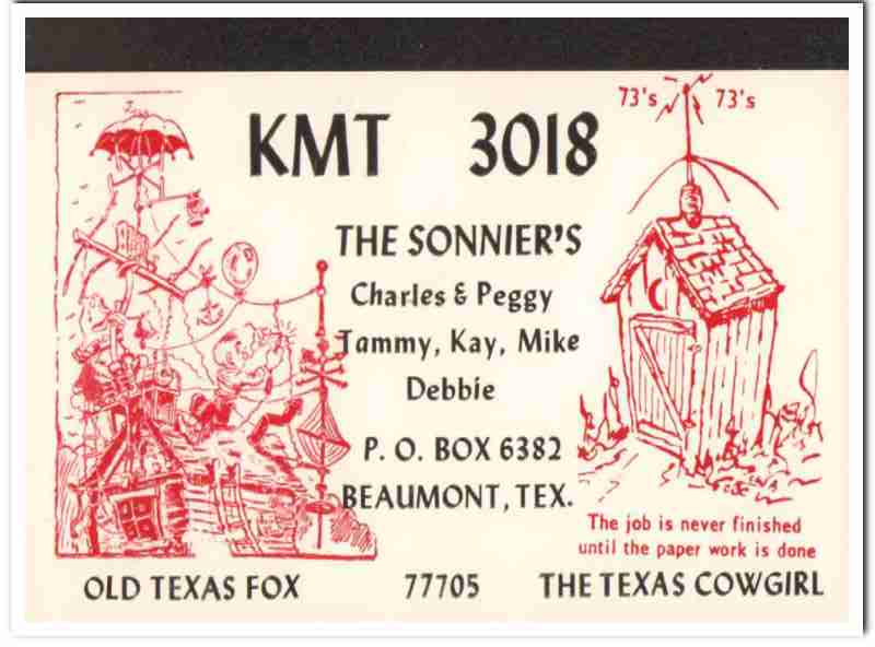 Original QSL postcard from the mid to late 1960s.This unused card was sent from CB radio station: KMT-3018. Was issued to Peggy and Charles Sonnier, of Beaumont, Texas. His CB handle was Old Texas Fox. Her CB handle was The Texas Cowgirl. Childrens names are Tammy, Kay, Mike and Debbie. During the 1920s and 1930s, amateur ham radio operators adopted the practice of two-way exchanging of QSL postcards, to confirm their radio contact, with a report of reception. QSL cards got to be known as wallpaper, commonly used to decorate the walls of their radio equipment room. During the 1960s, CB citizen band radio became popular, and the practice of exchanging QSL cards to confirm radio contacts was enjoyed by many with this new hobby. Today, these cards are very collectible and look great matted and framed.
