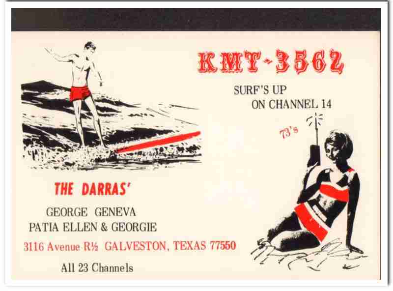Original QSL postcard from the mid to late 1960s.This unused card was sent from CB radio station: KMT-3562. Was issued to Geneva and George Darras, at 3116 Avenue R1/2, Galveston, Texas. Children names are Patia, Ellen and Georgie Darras. Surfs Up On Channel 14. During the 1920s and 1930s, amateur ham radio operators adopted the practice of two-way exchanging of QSL postcards, to confirm their radio contact, with a report of reception. QSL cards got to be known as wallpaper, commonly used to decorate the walls of their radio equipment room. During the 1960s, CB citizen band radio became popular, and the practice of exchanging QSL cards to confirm radio contacts was enjoyed by many with this new hobby. Today, these cards are very collectible and look great matted and framed.