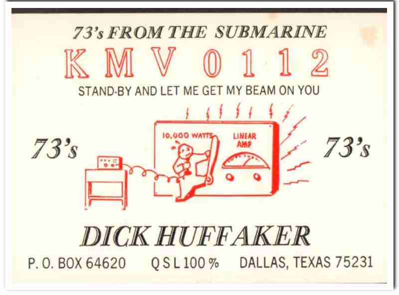 Original QSL postcard from the mid to late 1960s.This unused card was sent from CB radio station: KMV-0112. Was issued to Dick Huffaker, at 7239 Fenton Drive, Dallas, Texas. The Submarine. Stand-By And Let Me Get Me Beam On You, During the 1920s and 1930s, amateur ham radio operators adopted the practice of two-way exchanging of QSL postcards, to confirm their radio contact, with a report of reception. QSL cards got to be known as wallpaper, commonly used to decorate the walls of their radio equipment room. During the 1960s, CB citizen band radio became popular, and the practice of exchanging QSL cards to confirm radio contacts was enjoyed by many with this new hobby. Today, these cards are very collectible and look great matted and framed.