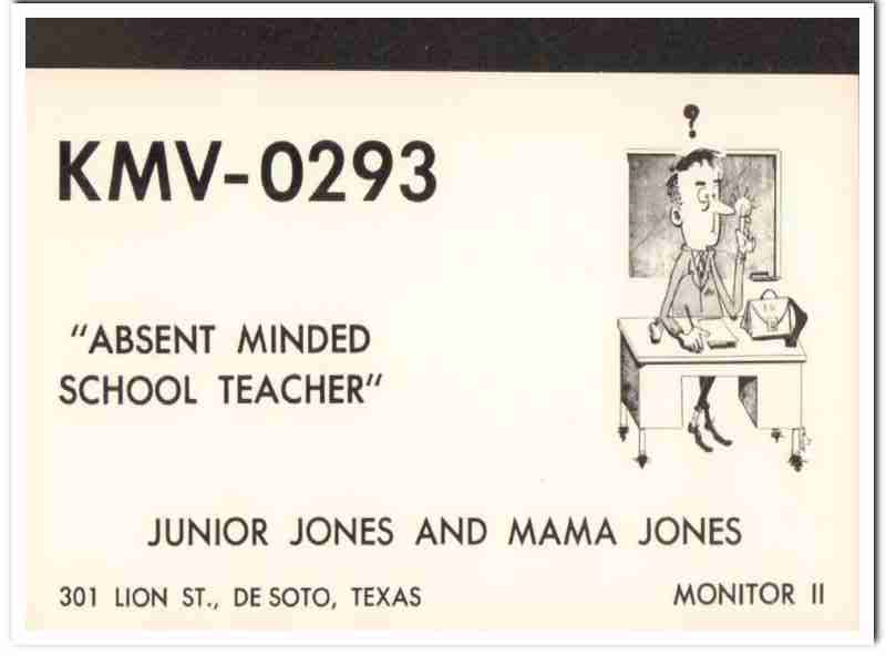 Original QSL postcard from the mid to late 1960s.This unused card was sent from CB radio station: KMV-0293. Was issued to Mama and Junior Jones, at 301 Lion Street, De Soto, Texas. Absent Minded School Teacher. During the 1920s and 1930s, amateur ham radio operators adopted the practice of two-way exchanging of QSL postcards, to confirm their radio contact, with a report of reception. QSL cards got to be known as wallpaper, commonly used to decorate the walls of their radio equipment room. During the 1960s, CB citizen band radio became popular, and the practice of exchanging QSL cards to confirm radio contacts was enjoyed by many with this new hobby. Today, these cards are very collectible and look great matted and framed.