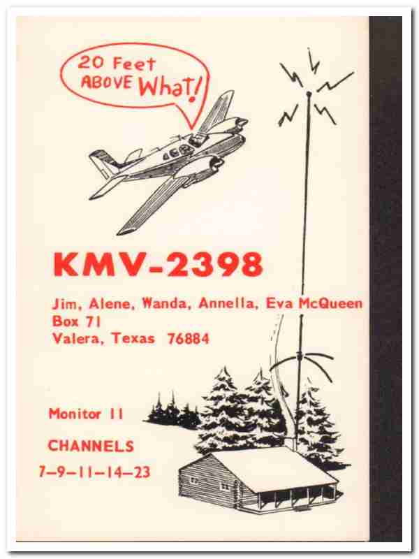 Original QSL postcard from the mid to late 1960s.This unused card was sent from CB radio station: KMV-2398. Was issued to Alene and Jim McQueen, of Valera, Texas. Children names are Wanda, Annella and Eva McQueen. 20 feet above what? During the 1920s and 1930s, amateur ham radio operators adopted the practice of two-way exchanging of QSL postcards, to confirm their radio contact, with a report of reception. QSL cards got to be known as wallpaper, commonly used to decorate the walls of their radio equipment room. During the 1960s, CB citizen band radio became popular, and the practice of exchanging QSL cards to confirm radio contacts was enjoyed by many with this new hobby. Today, these cards are very collectible and look great matted and framed.