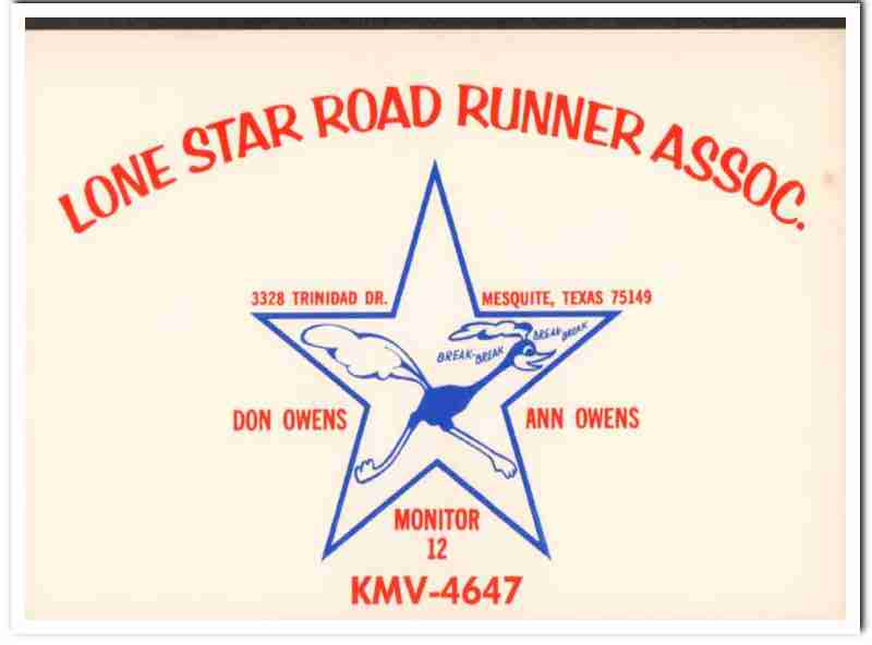 Original QSL postcard from the mid to late 1960s.This unused card was sent from CB radio station: KMV-4647. Was issued to Ann and Don Owens, at 3328 Trinidad Drive, Mesquite, Texas. Lone Star Road Runner Association. During the 1920s and 1930s, amateur ham radio operators adopted the practice of two-way exchanging of QSL postcards, to confirm their radio contact, with a report of reception. QSL cards got to be known as wallpaper, commonly used to decorate the walls of their radio equipment room. During the 1960s, CB citizen band radio became popular, and the practice of exchanging QSL cards to confirm radio contacts was enjoyed by many with this new hobby. Today, these cards are very collectible and look great matted and framed.