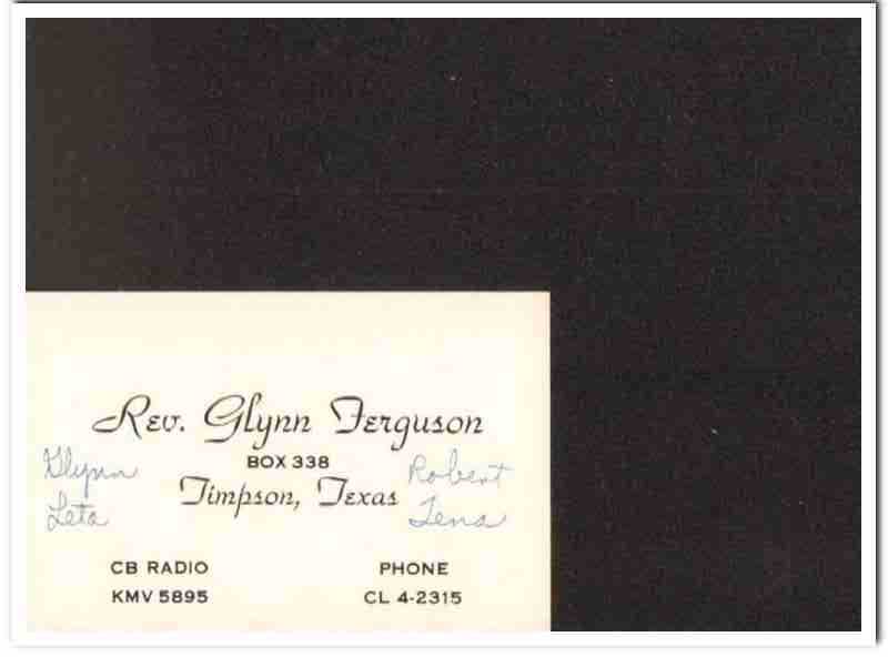 Original QSL postcard from the mid to late 1960s.This card was sent from CB radio station: KMV-5895. Was issued to Rev. Glynn Ferguson, of Timpson, Texas. Family member are Leta, Robert and Lena. Card is business-card size. During the 1920s and 1930s, amateur ham radio operators adopted the practice of two-way exchanging of QSL postcards, to confirm their radio contact, with a report of reception. QSL cards got to be known as wallpaper, commonly used to decorate the walls of their radio equipment room. During the 1960s, CB citizen band radio became popular, and the practice of exchanging QSL cards to confirm radio contacts was enjoyed by many with this new hobby. Today, these cards are very collectible and look great matted and framed.