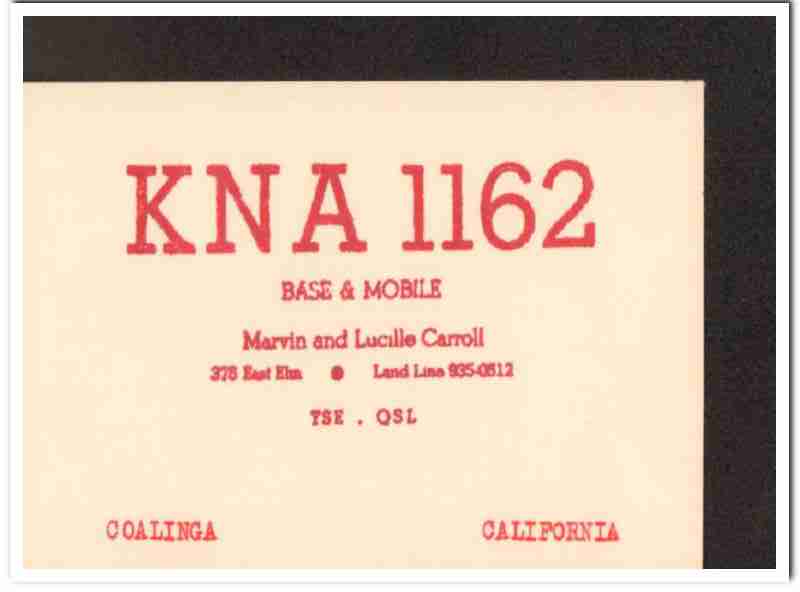 KNA-1162 Marvin Carroll Coalinga CA 1960s Vintage Postcard CB QSL