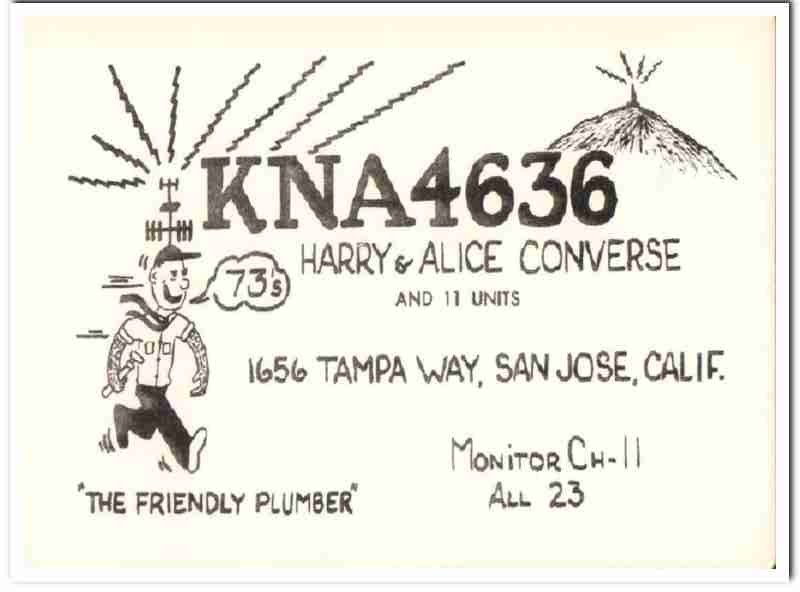 Original QSL postcard from the mid to late 1960s.This unused card was sent from CB radio station: KNA-4636. Was issued to Alice and Harry Converse, at 1656 Tampa Way, San Jose, California. His CB handle was The Friendly Plumber. During the 1920s and 1930s, amateur ham radio operators adopted the practice of two-way exchanging of QSL postcards, to confirm their radio contact, with a report of reception. QSL cards got to be known as wallpaper, commonly used to decorate the walls of their radio equipment room. During the 1960s, CB citizen band radio became popular, and the practice of exchanging QSL cards to confirm radio contacts was enjoyed by many with this new hobby. Today, these cards are very collectible and look great matted and framed.