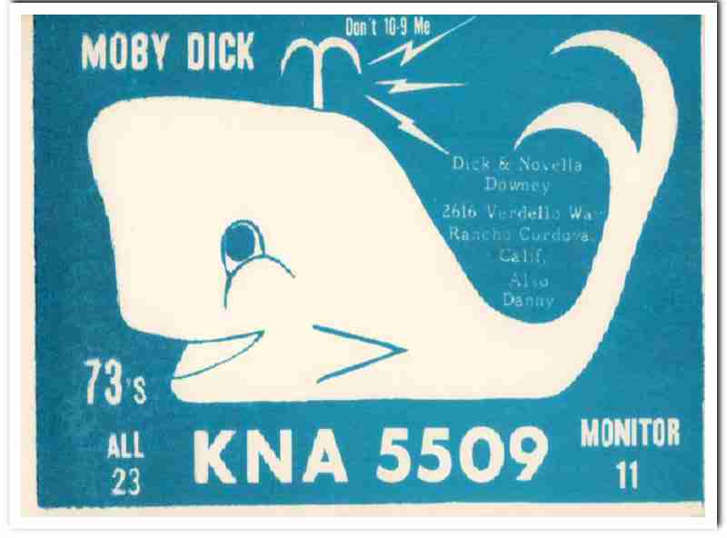 Original QSL postcard from the mid to late 1960s.This unused card was sent from CB radio station: KNA-5509. Was issued to Novella and Dick Downey, at 2616 Verdello Way, Rancho Cordova, California. His CB handle was Moby Dick. Child name is Danny Downey. During the 1920s and 1930s, amateur ham radio operators adopted the practice of two-way exchanging of QSL postcards, to confirm their radio contact, with a report of reception. QSL cards got to be known as wallpaper, commonly used to decorate the walls of their radio equipment room. During the 1960s, CB citizen band radio became popular, and the practice of exchanging QSL cards to confirm radio contacts was enjoyed by many with this new hobby. Today, these cards are very collectible and look great matted and framed.