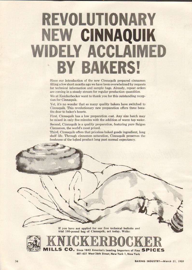 Original commercial bakery trade magazine vintage ad for KNICKERBOCKER MILLS COMPANY in New York City, NY. Cinnaquik cinnamon filling, revolutionary new product widely acclaimed by bakers. 1959 unique old baking industry advertisement
