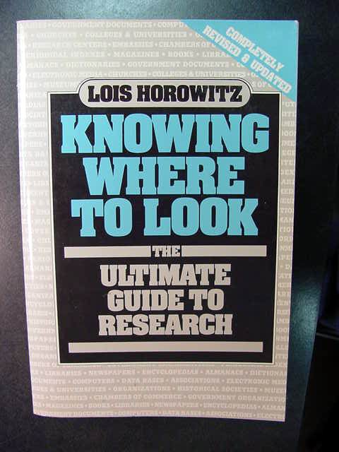Soft covered book titled KNOWING WHERE TO LOOK, THE ULTIMATE GUIDE TO RESEARCH by Lois Horowitz, 1988. 433 pages. Whether you're a consumer, parent, businessperson, student, teacher, writer, reporter, genealogist, or just someone who loves finding new facts, here is the book that will help you find what you need, when you need it, and make sure its the best information available on the subject. This book is in VG condition. Pages are clean and intact, and the binding is tight. It would make an excellent addition to your research library!