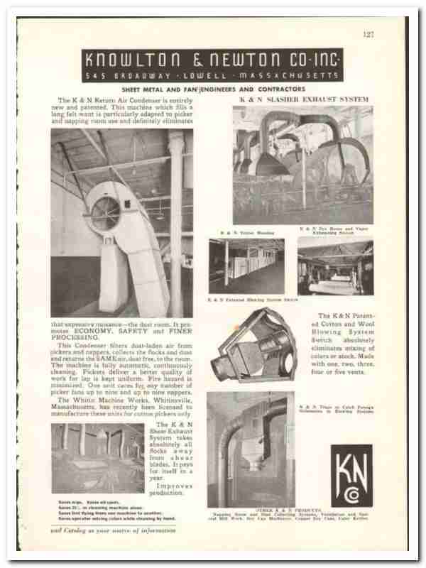 Original 1938 textile industrial trade vintage ad for KNOWLTON & NEWTON COMPANY, INC. Main office and plant was located at 646 Broadway, Lowell, MA.
