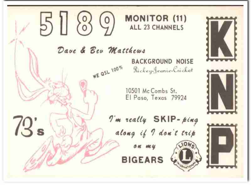 Original QSL postcard from the mid to late 1960s.This card was sent from CB radio station: KNP-5189. Was issued to Bev and Dave Matthews, at 10501 McCombs Street, El Paso, Texas. Childrn names are Rickey, Jeanie and Cricket. Im really SKIP-ping along if I dont trip on my BIGEARS. During the 1920s and 1930s, amateur ham radio operators adopted the practice of two-way exchanging of QSL postcards, to confirm their radio contact, with a report of reception. QSL cards got to be known as wallpaper, commonly used to decorate the walls of their radio equipment room. During the 1960s, CB citizen band radio became popular, and the practice of exchanging QSL cards to confirm radio contacts was enjoyed by many with this new hobby. Today, these cards are very collectible and look great matted and framed.
