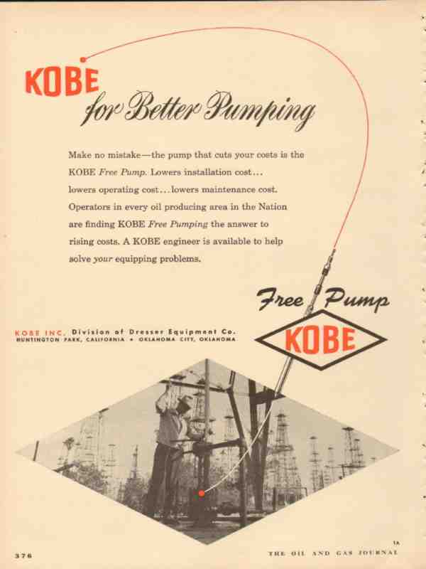 Kobe Inc 1953 Vintage Ad Oil Field Free Pumping Lower Costs Better