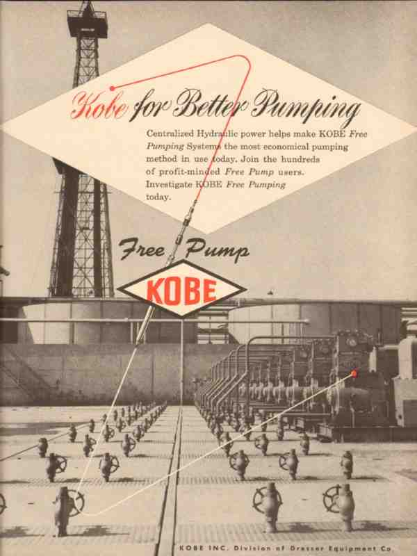 Original oil and gas trade magazine vintage ad for KOBE INC. of Huntington Park, CA. Division of Dresser Equipment Company. Kobe for Better Pumping. Centralized Hydraulic Power. Free Pump. Unique 1954 old oilfield petroleum pump industry magazine advertisement.