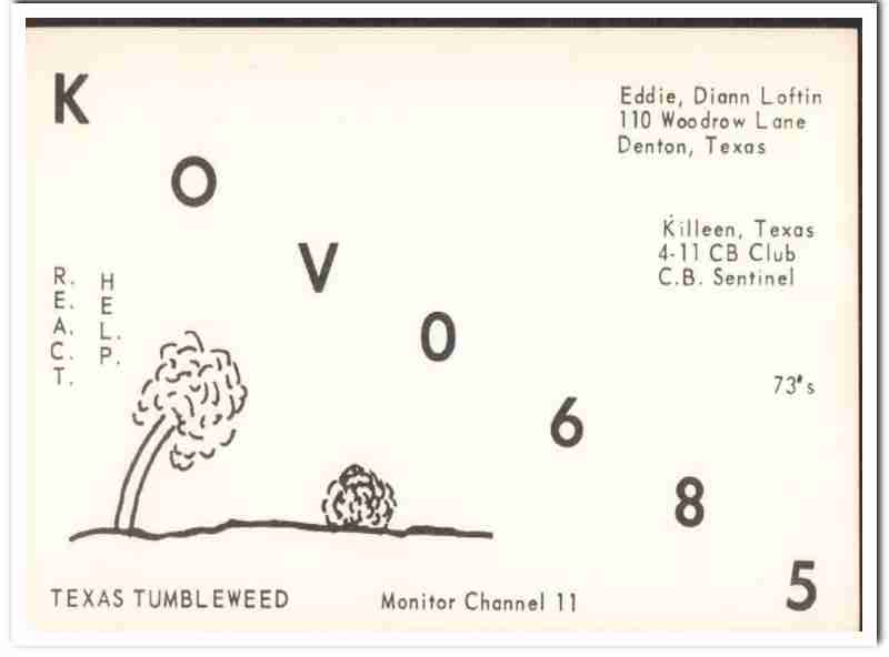 Original QSL postcard from the mid to late 1960s.This unused card was sent from CB radio station: KOV-0685. Was issued to Diann and Eddie Loftin, at 110 Woodrow Lane, Denton, Texas. His CB handle was Texas Tumbleweed. During the 1920s and 1930s, amateur ham radio operators adopted the practice of two-way exchanging of QSL postcards, to confirm their radio contact, with a report of reception. QSL cards got to be known as wallpaper, commonly used to decorate the walls of their radio equipment room. During the 1960s, CB citizen band radio became popular, and the practice of exchanging QSL cards to confirm radio contacts was enjoyed by many with this new hobby. Today, these cards are very collectible and look great matted and framed.