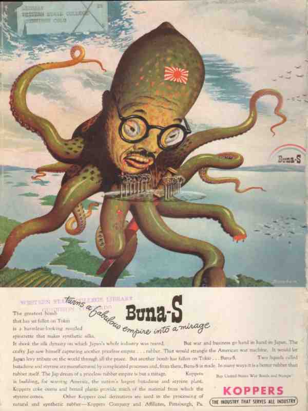 Buna-S Turns a Fabulous Empire Into a Mirage. Pictured is Emperor Hirohito portrayed as an octopus.