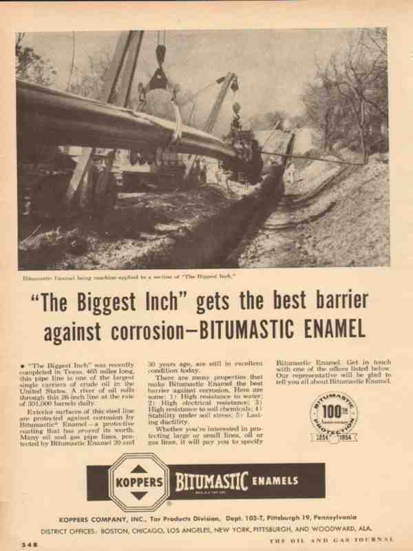 Original oil and gas trade magazine vintage ad for KOPPERS COMPANY, INC. of Pittsburgh, PA. The Biggest Inch gets the Best Barrier against Corrosion, Bitumastic Enamel. Unique 1954 old oilfield petroleum pipeline industry equipment magazine advertisement.