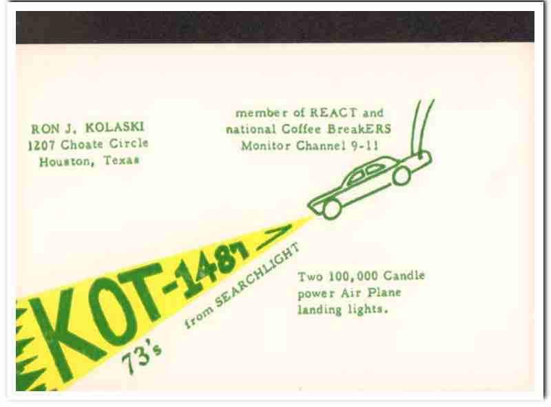 Original QSL postcard from the mid to late 1960s.This card was sent from CB radio station: KOT-1487. Was issued to Ron J. Kolaski, at 1207 Choate Circle, Houston, Texas. Searchlight, two 100,000 candle power air plane landing lights. Member of React. During the 1920s and 1930s, amateur ham radio operators adopted the practice of two-way exchanging of QSL postcards, to confirm their radio contact, with a report of reception. QSL cards got to be known as wallpaper, commonly used to decorate the walls of their radio equipment room. During the 1960s, CB citizen band radio became popular, and the practice of exchanging QSL cards to confirm radio contacts was enjoyed by many with this new hobby. Today, these cards are very collectible and look great matted and framed.